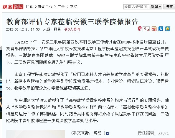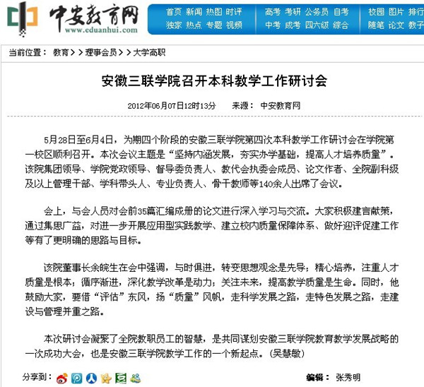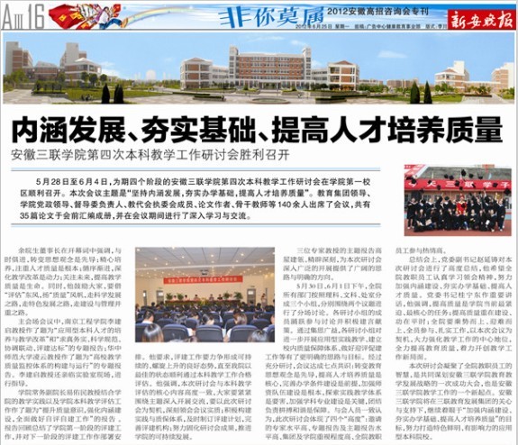 5月28日至6月4日,為期四個階段的安徽三聯(lián)學(xué)院第四次本科教學(xué)工作研討會在學(xué)院第一校區(qū)順利召開。會議圍繞“構(gòu)建校內(nèi)教學(xué)質(zhì)量保障體系的探索”和“應(yīng)用型本科人才實(shí)踐教育教學(xué)的探索與實(shí)踐”兩個議題進(jìn)行了深入的研究和探討,并達(dá)成了高度共識。本次會議也受到了省內(nèi)外多家平面和網(wǎng)絡(luò)媒體的高度關(guān)注,網(wǎng)易新聞、安徽青年報(bào)、新安晚報(bào)、市場星報(bào)、中安在線、新安傳媒網(wǎng)均從不同的角度對本次研討會進(jìn)行了報(bào)道。