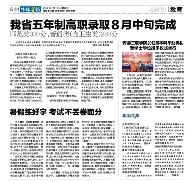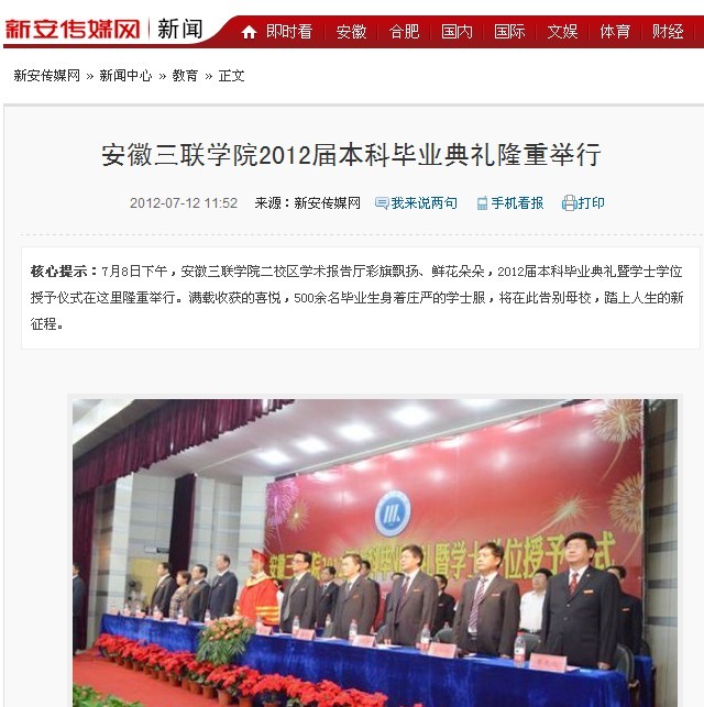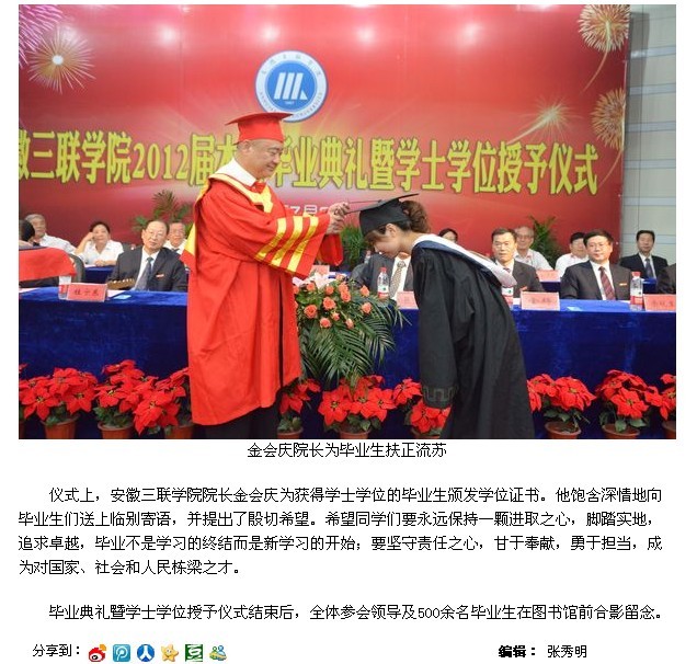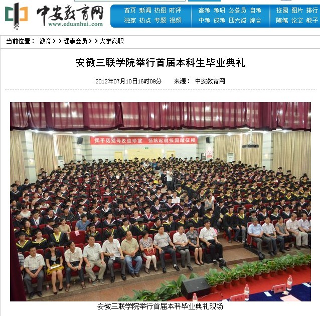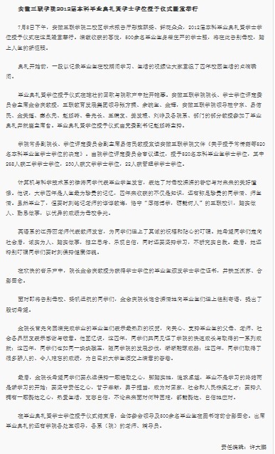 7月8日下午,安徽三聯(lián)學(xué)院2012屆本科畢業(yè)典禮在我院二校區(qū)學(xué)術(shù)報(bào)告廳舉行。500余名畢業(yè)生身著莊嚴(yán)的學(xué)士服,將在此告別母校,踏上人生的新征程。由院學(xué)位評(píng)定委員會(huì)審議通過(guò),授予520名本科畢業(yè)生學(xué)士學(xué)位,其中 268人獲工學(xué)學(xué)士學(xué)位,230人獲文學(xué)學(xué)士學(xué)位,22人獲管理學(xué)學(xué)士學(xué)位。這是我院首次本科畢業(yè)典禮,意義重大,獲得了省內(nèi)多家知名媒體的高度關(guān)注,它們均用不同的篇幅,第一時(shí)間報(bào)道了我院畢業(yè)典禮的盛況。