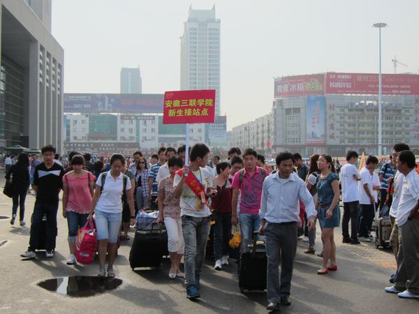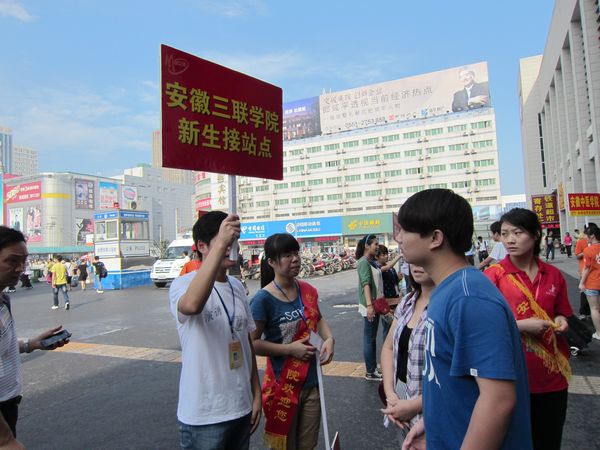 校車到達(dá)車站后,迎新工作迅速展開。志愿者們分派成小組,到各接站點(diǎn)。為了讓新同學(xué)迅速找到“集體”,他們打出十二分的精神,高舉著“安徽三聯(lián)學(xué)院接待點(diǎn)”的牌子,等候在火車站及各汽車站的出站口。