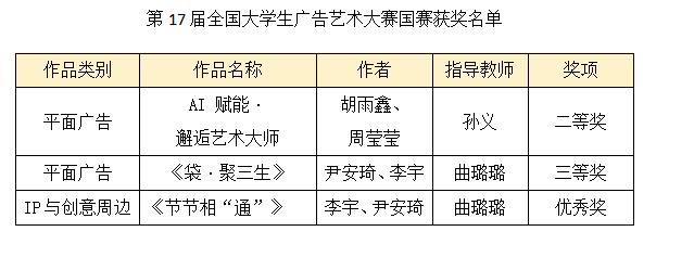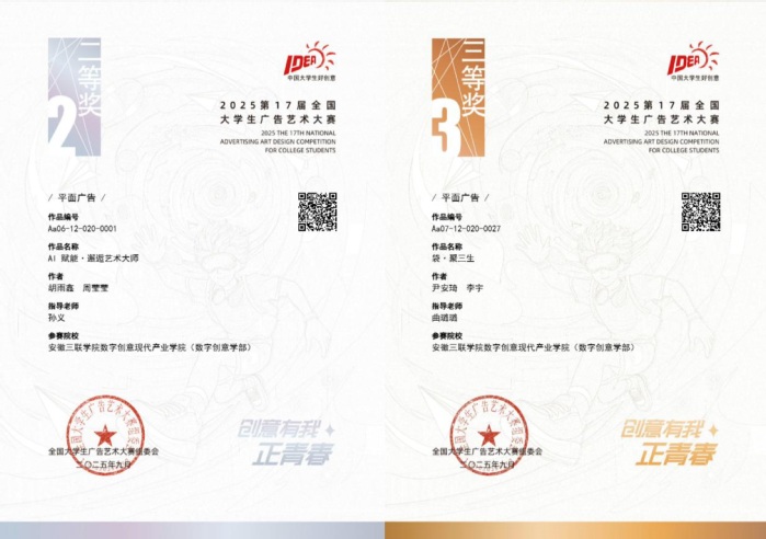 近日,第十七屆全國大學生廣告藝術(shù)大賽全國性賽事獲獎名單發(fā)布。安徽三聯(lián)學院數(shù)字創(chuàng)意現(xiàn)代產(chǎn)業(yè)學院師生憑借扎實的專業(yè)功底與出色的創(chuàng)新能力,在賽事中表現(xiàn)亮眼,榮獲國家級二等獎 1 項、國家級三等獎 1 項;省級二等獎 7 項、省級三等獎 15 項,充分展現(xiàn)出我校學子在廣告創(chuàng)意設計領(lǐng)域的強勁實力,彰顯了學校的育人成果。
