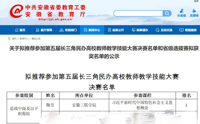近日,安徽省教育廳公示了第五屆長三角民辦高校教師教學(xué)競賽省級選拔賽結(jié)果,馬克思主義學(xué)院教師鞠芳憑借扎實的教學(xué)功底、創(chuàng)新的教學(xué)設(shè)計與深厚的思政育人底蘊,在思政中級及以下職稱組賽道中脫穎而出,以第一名的優(yōu)異成績斬獲省賽桂冠,成功晉級總決賽,充分展現(xiàn)了我校教師過硬的教學(xué)能力與思政教育教學(xué)水平。