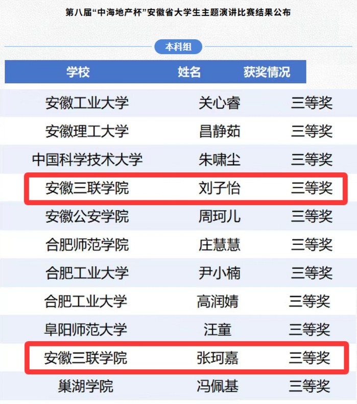 近日,由共青團安徽省委員會、安徽省教育廳、安徽省學(xué)生聯(lián)合會共同主辦的第八屆“中海地產(chǎn)杯”安徽省大學(xué)生主題演講比賽順利落幕。我校兩名學(xué)子在全省 294 名參賽選手中脫穎而出,均榮獲本科組三等獎。