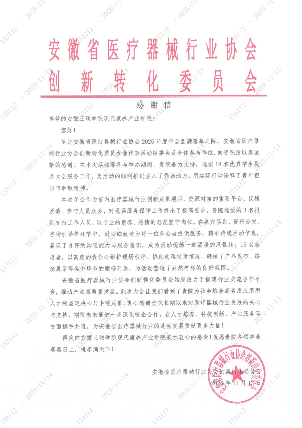 近日,安徽省醫(yī)療器械行業(yè)協(xié)會創(chuàng)新轉化委員會向我校發(fā)來感謝信,對我校在其近期舉辦的安徽省醫(yī)療器械行業(yè)協(xié)會2025年度年會籌備和會務期間所給予的大力支持表示感謝。
