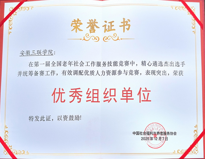 近日,第一屆全國老年社會工作服務技能競賽總決賽順利落下帷幕。安徽三聯(lián)學院三支參賽團隊均獲優(yōu)秀獎,同時,學校還被授予優(yōu)秀組織單位稱號,實現(xiàn)競賽成績與組織榮譽雙豐收。此次競賽由中國社會福利與養(yǎng)老服務協(xié)會主辦,以“錘煉專業(yè)技能,賦能老年服務”為宗旨,設(shè)置了團體情景演示、實務方案答辯等多個環(huán)節(jié),全面考察團隊理論應用、現(xiàn)場處置及協(xié)作能力。