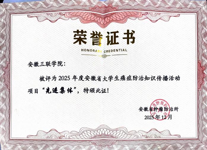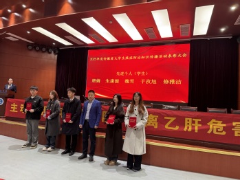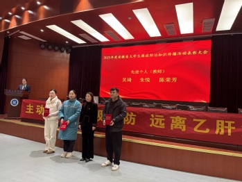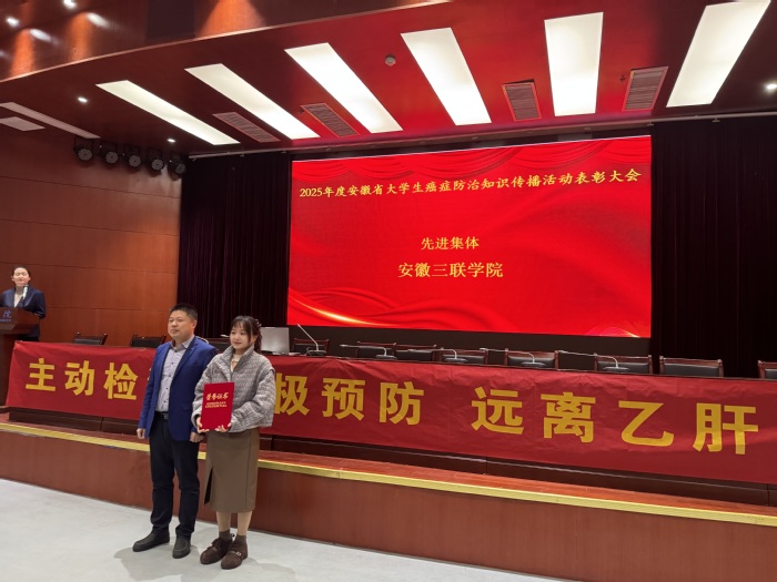 徐輝代表安徽省腫瘤防治所宣讀了表彰決定,安徽三聯(lián)學院獲評安徽省大學生癌癥防治知識傳播活動項目先進集體。隨后,徐輝為癌癥防治工作先進集體代表頒獎,范兆紅為先進個人頒發(fā)榮譽證書。