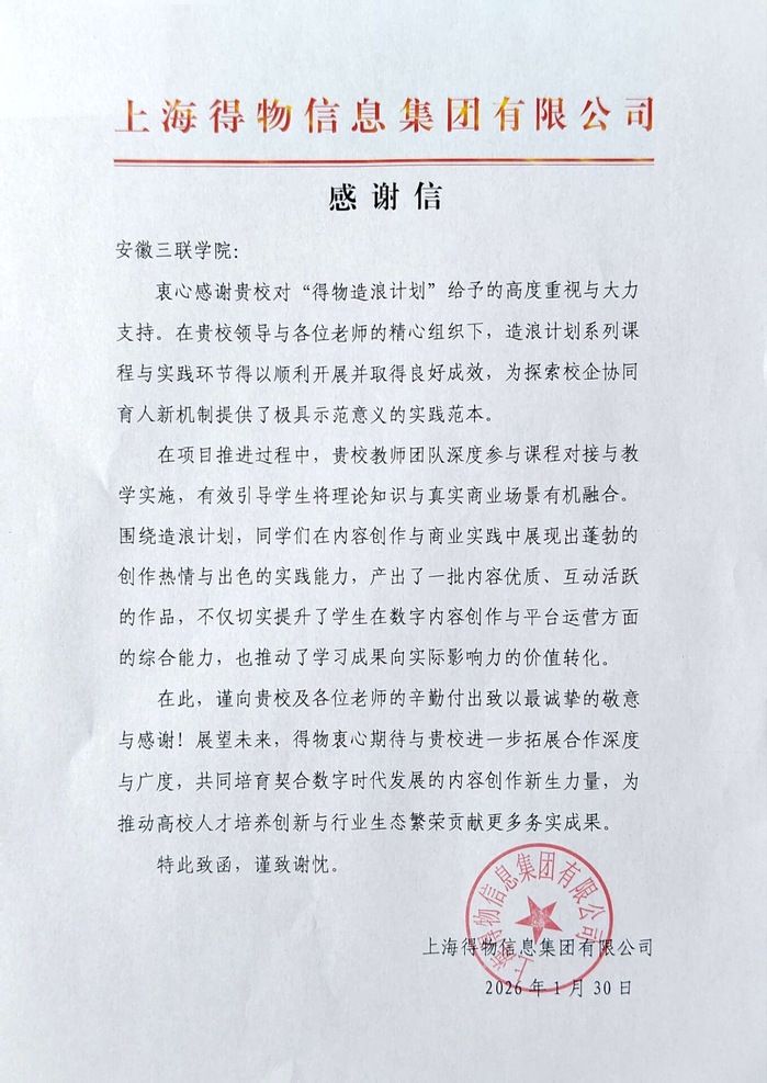 近日,上海得物信息集團(tuán)有限公司向安徽三聯(lián)學(xué)院發(fā)來感謝信,高度評(píng)價(jià)雙方合作開展的“得物造浪計(jì)劃”項(xiàng)目成果。充分肯定該項(xiàng)目已成為深化產(chǎn)教融合、探索協(xié)同育人的成功實(shí)踐。