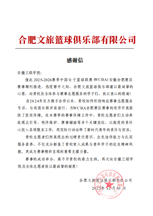 近日,我校收到來自合肥文旅籃球俱樂部有限公司的感謝信。信中,對方對我校在2025-2026賽季中國女子籃球聯(lián)賽(WCBA)安徽合肥賽區(qū)賽事保障工作中給予的大力支持表示誠摯感謝,對全體參與學(xué)子的志愿服務(wù)表示高度認(rèn)可和贊揚(yáng)。