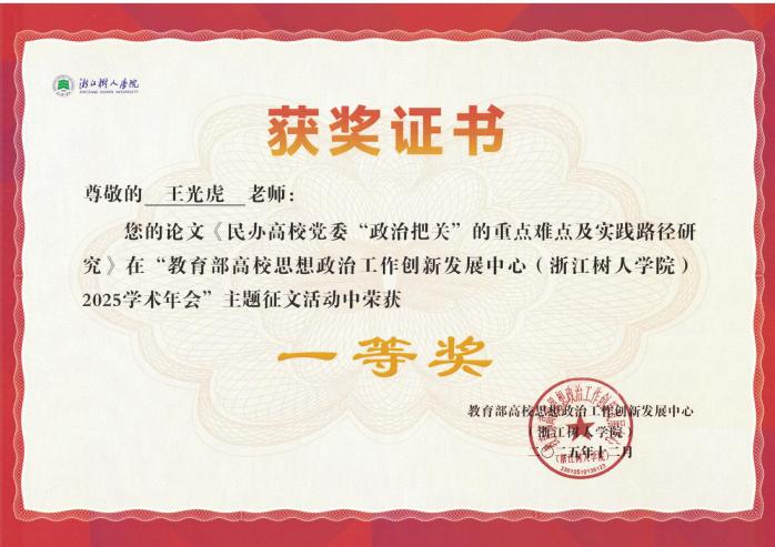 王光虎為本次學(xué)術(shù)年會(huì)撰寫的論文《民辦高校黨委政治把關(guān)的重點(diǎn)難點(diǎn)及實(shí)踐路徑研究》經(jīng)專家盲審、集中會(huì)審等多輪嚴(yán)格評(píng)審,榮獲一等獎(jiǎng)。馬克思主義學(xué)院院長(zhǎng)余暉撰寫的論文《“主軸引領(lǐng)、六維協(xié)同”--構(gòu)建高質(zhì)量大思政課育人模式的創(chuàng)新實(shí)踐》獲評(píng)三等獎(jiǎng)。