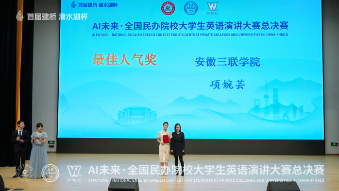 12月27日,首屆“滴水湖杯”AI未來(lái)·全國(guó)民辦院校大學(xué)生英語(yǔ)演講大賽總決賽圓滿落幕。我校文學(xué)部學(xué)子項(xiàng)婉蕓表現(xiàn)出色,一舉斬獲總決賽一等獎(jiǎng)和最佳人氣獎(jiǎng)。