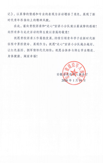 近日,安徽三聯(lián)學(xué)院收到安徽省退役軍人事務(wù)廳發(fā)來(lái)的感謝信,信中對(duì)學(xué)校在2025年安徽省“最美退役軍人”和“最美擁軍人物”發(fā)布儀式中給予的大力支持、作出的突出貢獻(xiàn)給予高度贊譽(yù),對(duì)參與活動(dòng)的師生團(tuán)隊(duì)致以崇高敬意。這封沉甸甸的感謝信,既是對(duì)學(xué)校擁軍工作與育人成效的充分肯定,更是對(duì)全體三聯(lián)人傳承紅色基因、厚植擁軍情懷的莫大鼓舞。