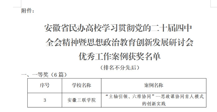 近日,安徽省高等學(xué)校思想政治教育研究會(huì)公布民辦高校優(yōu)秀思政工作案例評(píng)選結(jié)果,我校馬克思主義學(xué)院申報(bào)的《主軸引領(lǐng),六維協(xié)同——思政課協(xié)同育人模式的創(chuàng)新實(shí)踐》案例榮獲一等獎(jiǎng)。